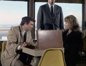 Just before Margaret boards her flight, Leslie slides a cash-filled briefcase across the counter to her and tells her that someone will meet her at the other end of her flight and open a bank account for her. Margaret boards the plane, and a few moments later, Leslie encounters Lieutenant Columbo. He is reading a newspaper and waiting waiting to talk to her. They sit down at a table at the airport café to have drinks and to talk, and in the middle of their conversation a plainclothes officer brings Columbo the same briefcase Leslie gave to Margaret before she boarded the plane.