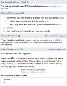 Here is some of the information available at blueletterbible.org about the word translated “seared with a hot iron” in 1 Timothy 4:2: